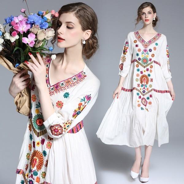ワンピース 刺繍 エスニック ふんわり ミモレ丈 ワンピ 白 レディース Efgwi Cocounsecret 通販 Yahoo ショッピング